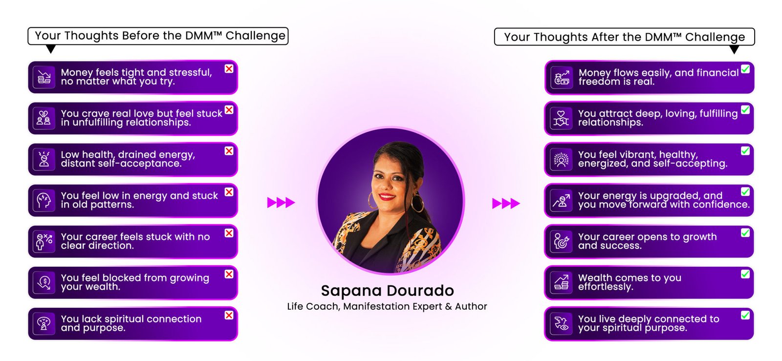 Experience a live session with Sapana Dourado, renowned Life & Manifestation Coach and Author, and unlock a higher frequency of manifestation.